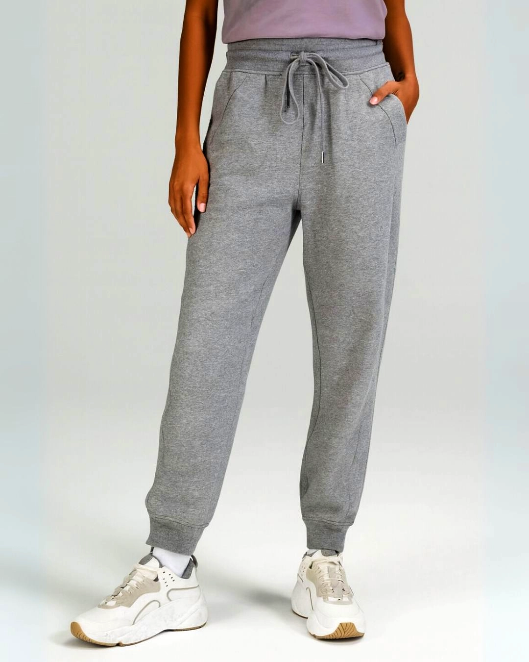 These jogger pants feature a relaxed tapered fit, elasticated waistband with adjustable drawstring, side seam pockets, and ribbed cuffs, creating a cozy yet sporty everyday look.