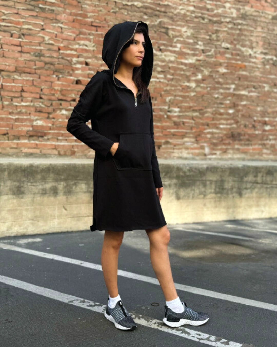 This casual hoodie dress features a half-zip front, a roomy hood, long sleeves, and a large kangaroo pocket. It’s perfect for creating a sporty and comfortable everyday outfit.